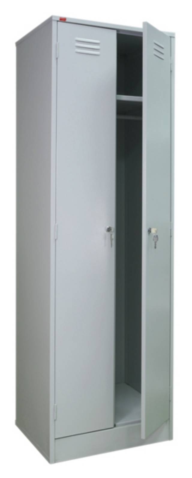 Шкаф металлический разборный двухсекционный, для хранения сменной одежды. В отделении - полка для головного убора и перекладина для вешалки. Врезной замок. Полимерное порошковое покрытие.